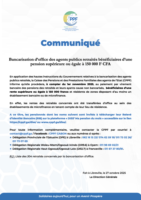 En application des hautes instructions du Gouvernement relatives à la bancarisation des agents publics retraités, la Caisse des Pensions et des Prestations Familiales des agents de l’Etat (CPPF) informe qu’elle procèdera, à compter du 1er novembre 2025, au paiement par virement bancaire des pensions des retraités et leurs ayants cause non bancarisés, bénéficiaires d’une rente supérieure ou égale à 150 000 francs et résidents de zones disposant d’au moins un établissement bancaire ou de microfinance.