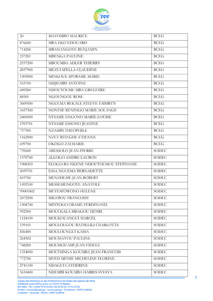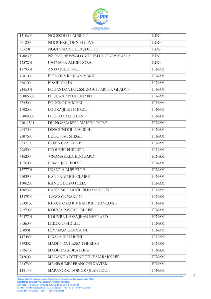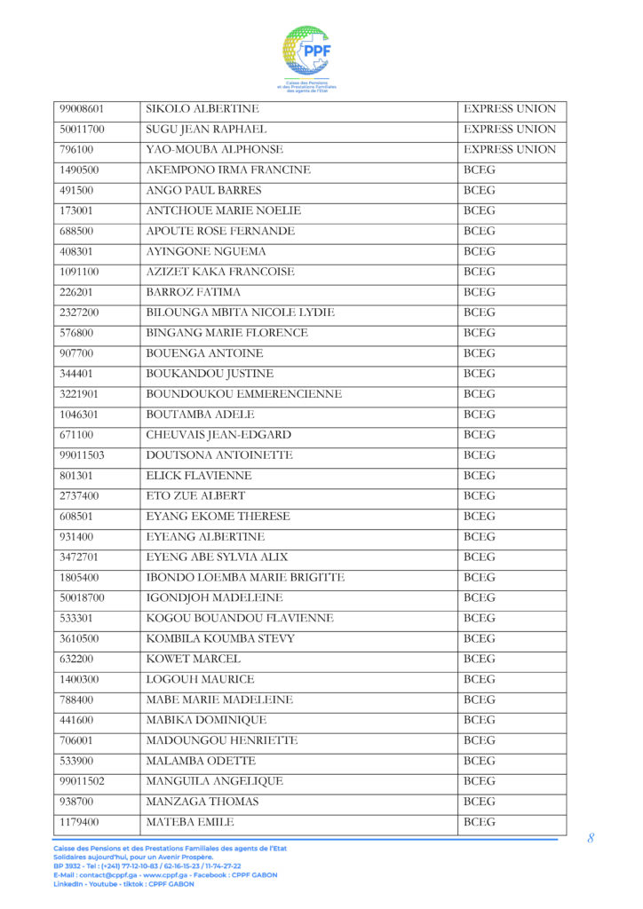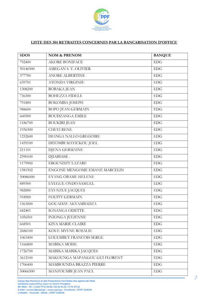 A ce titre, les pensionnés dont les noms suivent sont invités à télécharger leur Relevé d’Identité Bancaire (RIB) sur la plateforme « DISS’ Ma pension du mois » accessible sur le lien https://cppf.ga/diss/ ou www.cppf.ga/diss/.