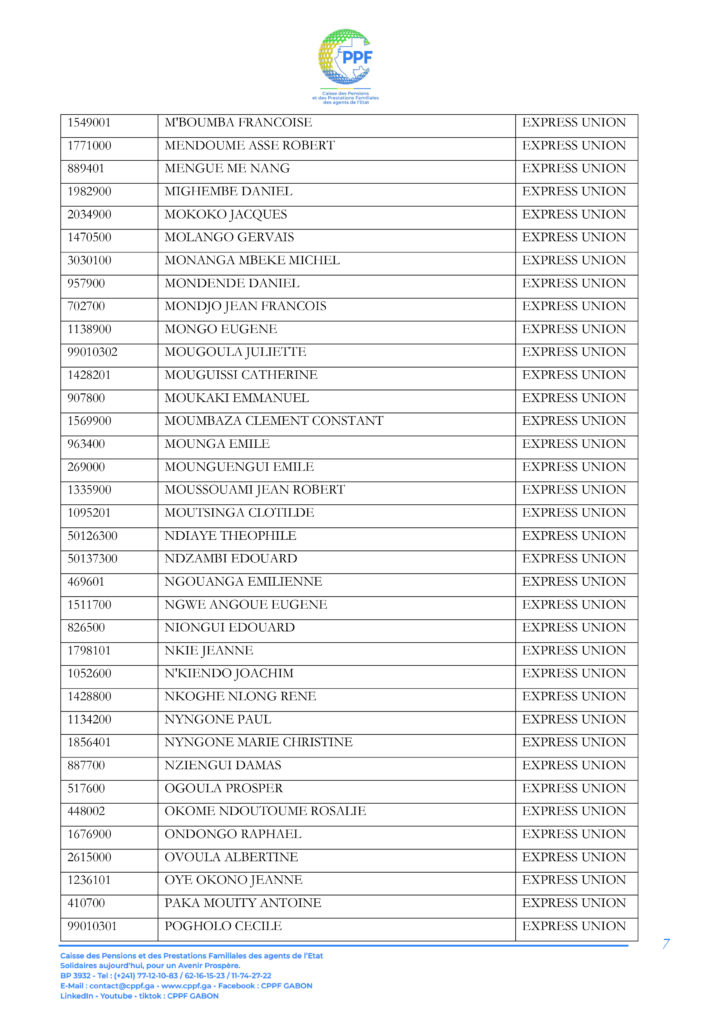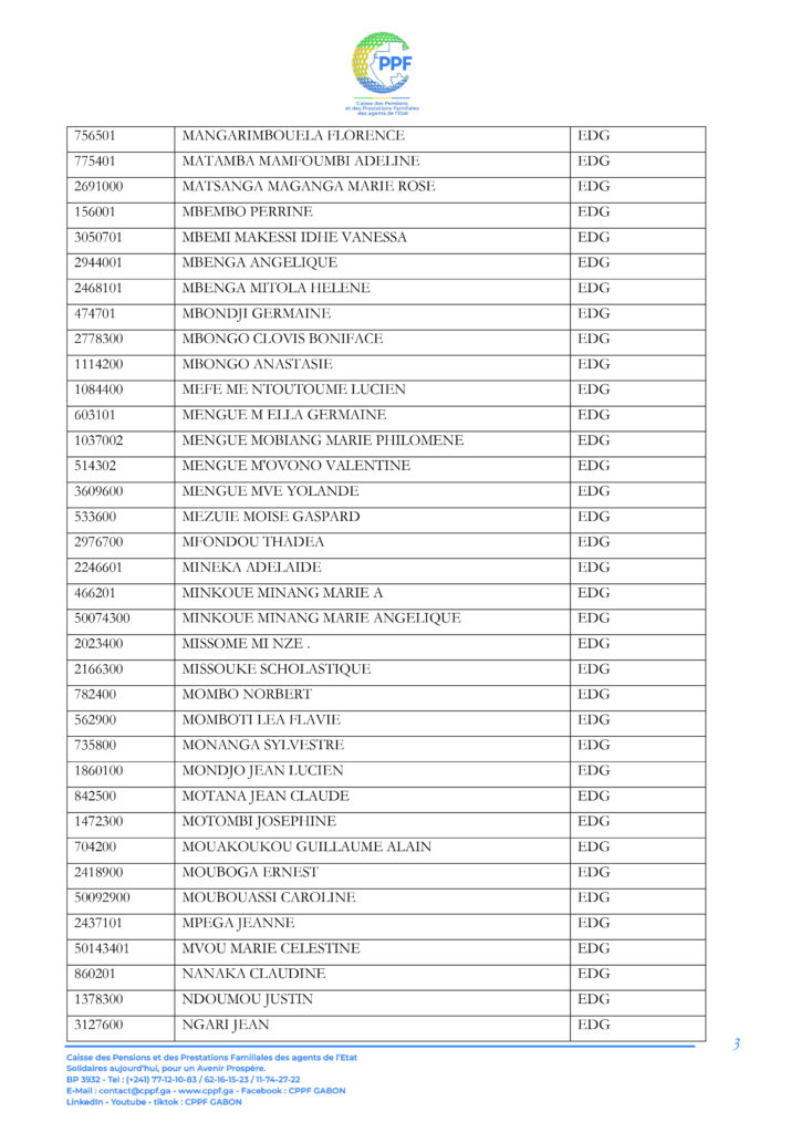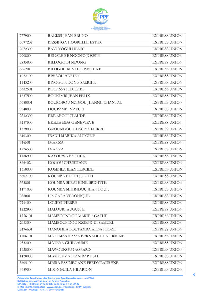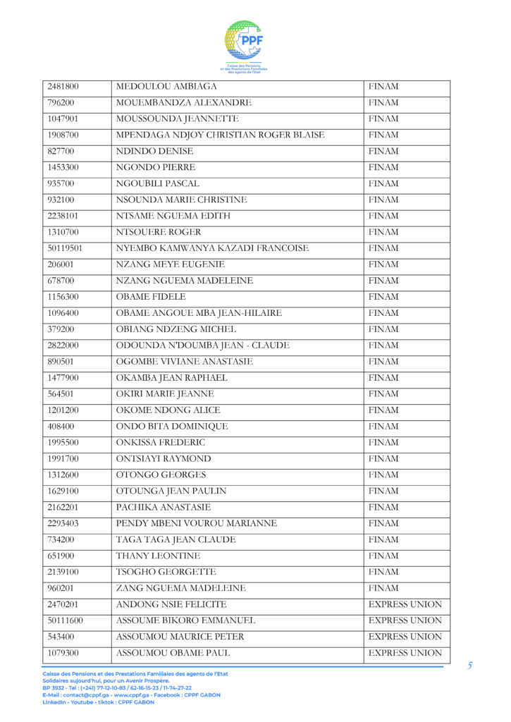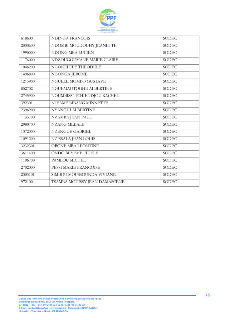 A ce titre, les pensionnés dont les noms suivent sont invités à télécharger leur Relevé d’Identité Bancaire (RIB) sur la plateforme « DISS’ Ma pension du mois » accessible sur le lien https://cppf.ga/diss/ ou www.cppf.ga/diss/.