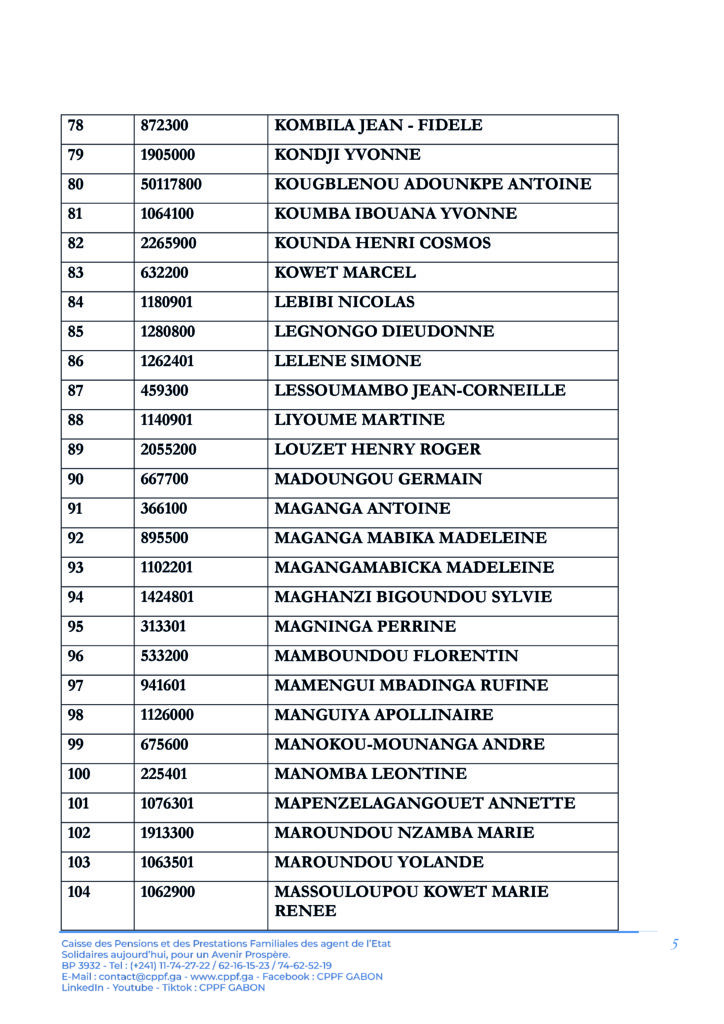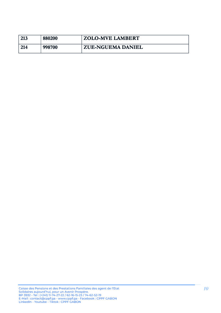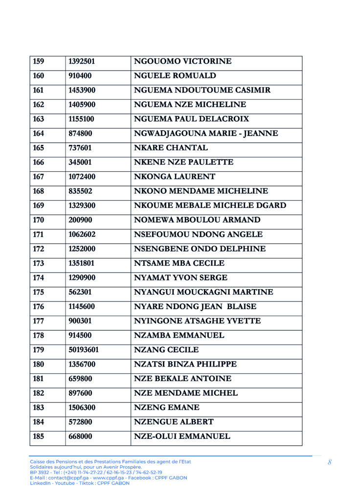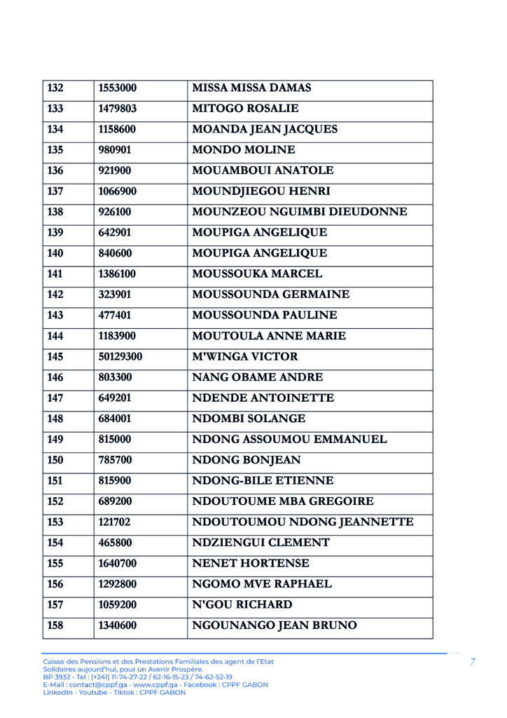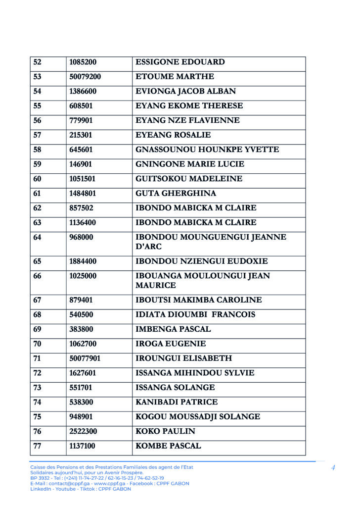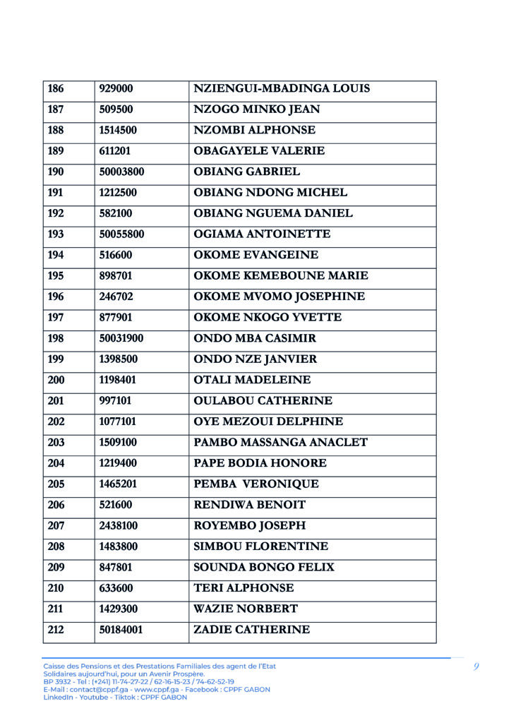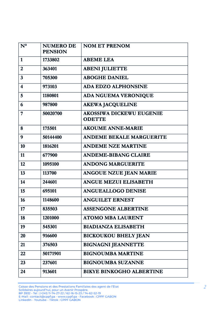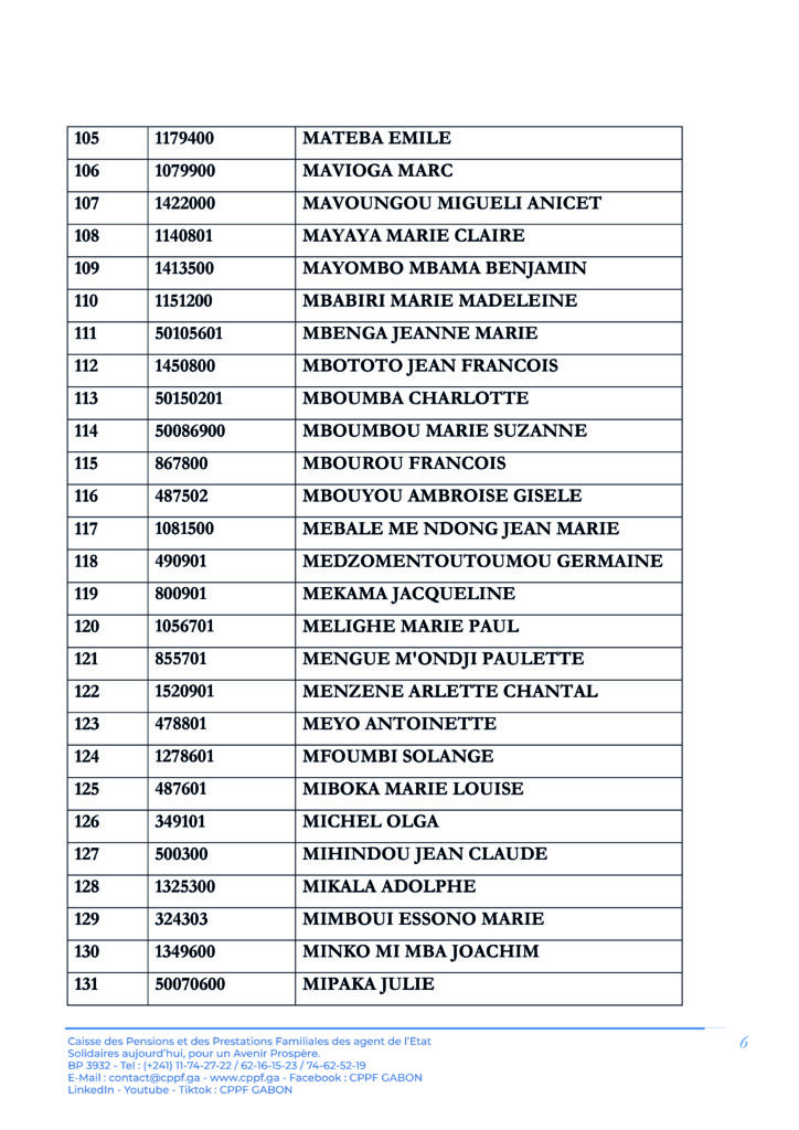 La Caisse des Pensions et des Prestations Familiales des Agents de l’État (CPPF) porte à la connaissance des assurés payés par carte Trésor, dont les noms figurent sur la liste ci-dessous, qu’il leur est demandé de se présenter impérativement auprès de ses bureaux régionaux et provinciaux (à Libreville, Franceville et Oyem), ou des postes comptables du Trésor Public proches de leurs domiciles, avant le 15 octobre 2025, pour affaire les concernant.